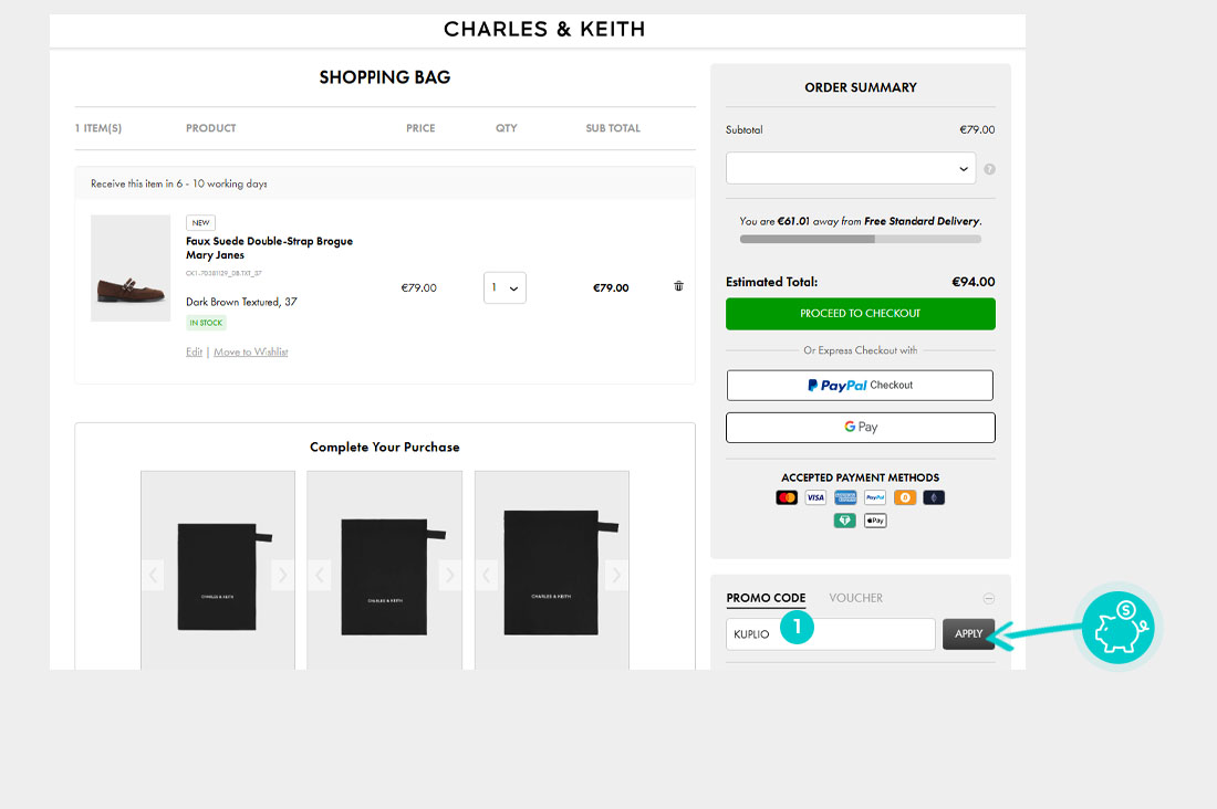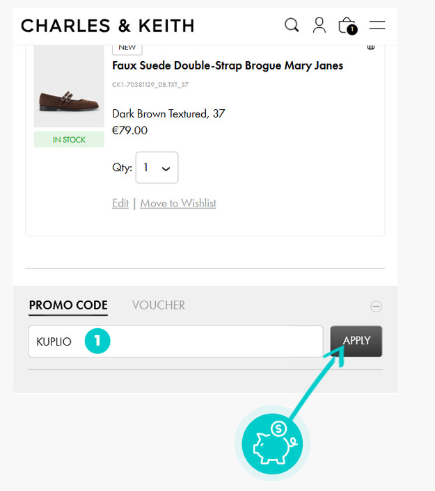 Nežinote kaip tiksliai veikia nuolaidų kodai CharlesKeith.eu? Siūlome metodą, kaip greitai ir paprastai pritaikyti nuolaidų kodus perkant:
