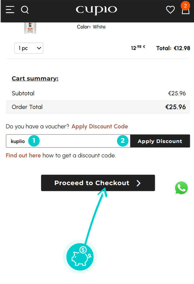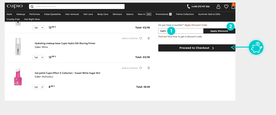 Išsirinkite Jus dominančią prekę elektroninėje parduotuvėje Cupiocosmetics.com, paspauskite mygtuką "Į krepšelį" ir prekė bus automatiškai įtraukta į pirkinių krepšelį. Tiesiogiai pirkinių krepšelyje dešinėje skiltyje „Suvestinė“ rasite langelį „Įveskite nuolaidos kodą“. Nukopijuotą nuolaidos kodą įklijuokite čia arba įveskite rankiniu būdu ir patvirtinkite mygtuku „Taikyti“.