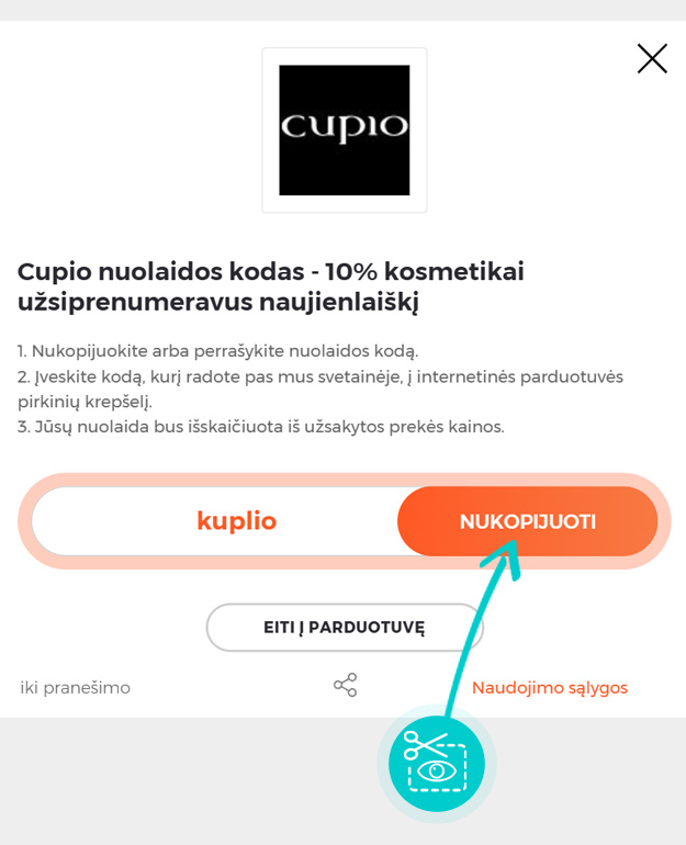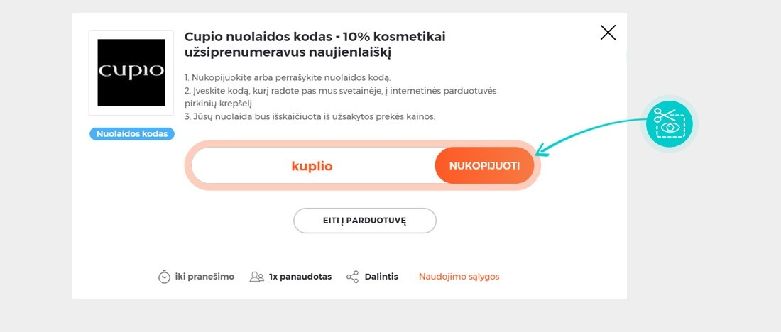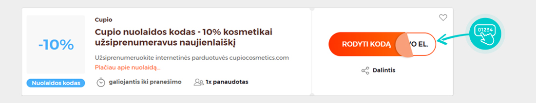 Mūsų svetainėje pasirinkite konkrečią Cupio nuolaidą ir spustelėkite mygtuką "Žiūrėti nuolaidą". Būsite automatiškai nukreipti tiesiai į internetinės parduotuvės Cupiocosmetics.com reklaminį pasiūlymą, kuriame prekę galėsite įsigyti su nuolaida.