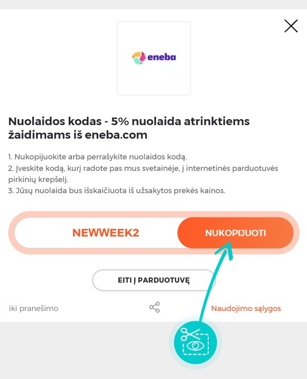 Nukopijuokite arba užsirašykite nuolaidos kodą ir paspauskite mygtuką „Eiti į parduotuvę“. Tada būsite nukreipti tiesiai į elektroninę parduotuvę Eneba.lt