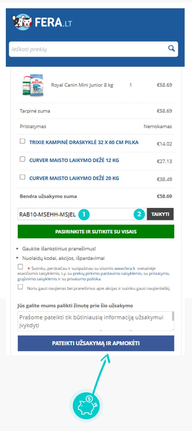 Išsirinkite Jus dominančią prekę elektroninėje parduotuvėje Fera.lt, paspauskite mygtuką "Į krepšelį" ir prekė bus automatiškai įtraukta į pirkinių krepšelį. Tiesiogiai pirkinių krepšelyje dešinėje skiltyje „Suvestinė“ rasite langelį „Įveskite nuolaidos kodą“. Nukopijuotą nuolaidos kodą įklijuokite čia arba įveskite rankiniu būdu ir patvirtinkite mygtuku „Taikyti“.