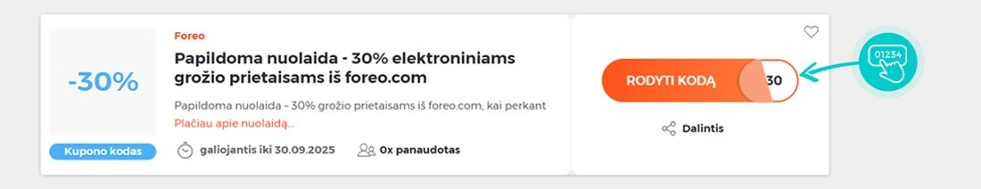 Mūsų svetainėje pasirinkite konkrečią Foreo nuolaidą ir spustelėkite mygtuką "Žiūrėti nuolaidą". Būsite automatiškai nukreipti tiesiai į internetinės parduotuvės Foreo.com reklaminį pasiūlymą, kuriame prekę galėsite įsigyti su nuolaida.