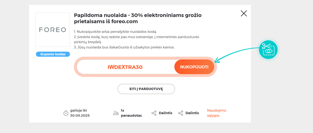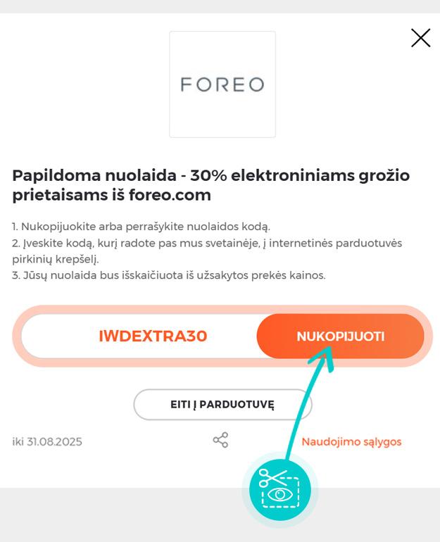 Nukopijuokite arba užsirašykite nuolaidos kodą ir paspauskite mygtuką „Eiti į parduotuvę“. Tada būsite nukreipti tiesiai į elektroninę parduotuvę Foreo.com