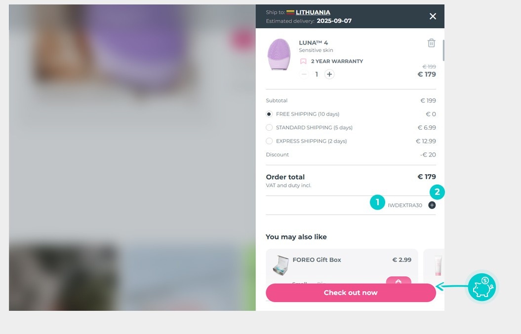 Išsirinkite Jus dominančią prekę elektroninėje parduotuvėje Foreo.com, paspauskite mygtuką "Į krepšelį" ir prekė bus automatiškai įtraukta į pirkinių krepšelį. Tiesiogiai pirkinių krepšelyje dešinėje skiltyje „Suvestinė“ rasite langelį „Įveskite nuolaidos kodą“. Nukopijuotą nuolaidos kodą įklijuokite čia arba įveskite rankiniu būdu ir patvirtinkite mygtuku „Taikyti“.