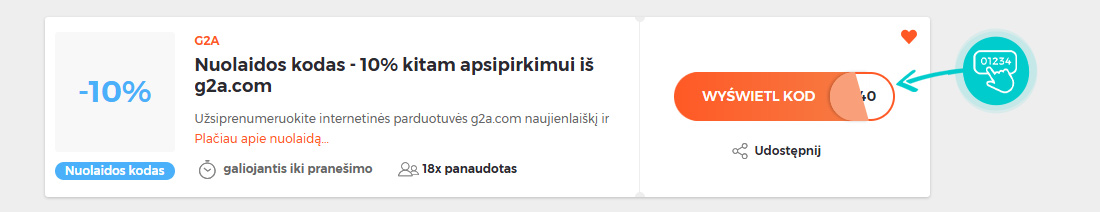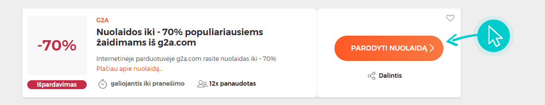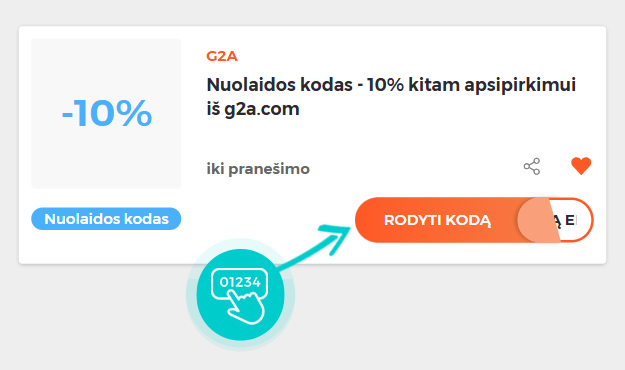 Mūsų svetainėje pasirinkite konkrečią G2A nuolaidą ir spustelėkite mygtuką "Žiūrėti nuolaidą". Būsite automatiškai nukreipti tiesiai į internetinės parduotuvės g2a.com reklaminį pasiūlymą, kuriame prekę galėsite įsigyti su nuolaida.