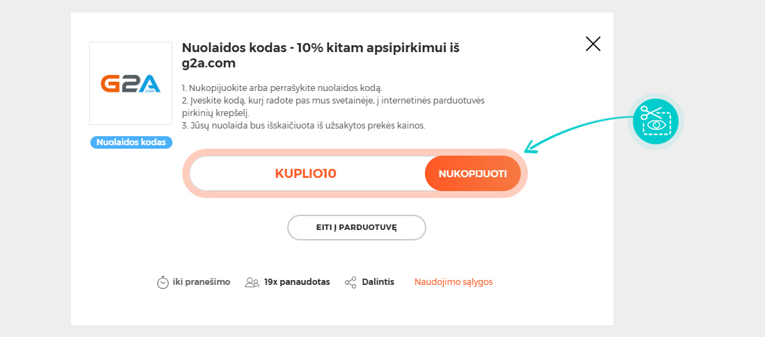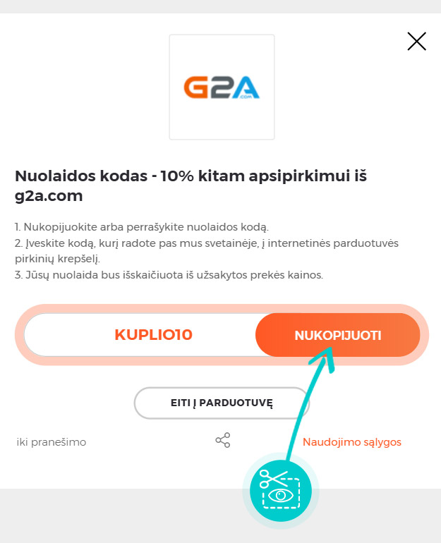 Nukopijuokite arba užsirašykite nuolaidos kodą ir paspauskite mygtuką „Eiti į parduotuvę“. Tada būsite nukreipti tiesiai į elektroninę parduotuvę g2a.com.