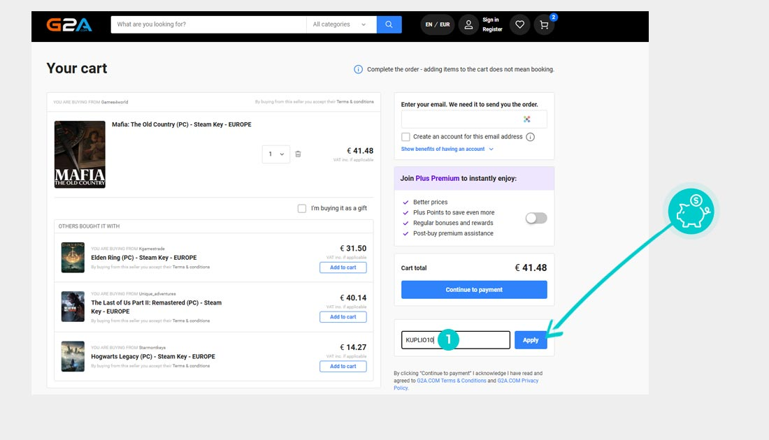 Išsirinkite Jus dominančią prekę elektroninėje parduotuvėje g2a.com, paspauskite mygtuką "Į krepšelį" ir prekė bus automatiškai įtraukta į pirkinių krepšelį. Tiesiogiai pirkinių krepšelyje dešinėje skiltyje „Suvestinė“ rasite langelį „Įveskite nuolaidos kodą“. Nukopijuotą nuolaidos kodą įklijuokite čia arba įveskite rankiniu būdu ir patvirtinkite mygtuku „Taikyti“.