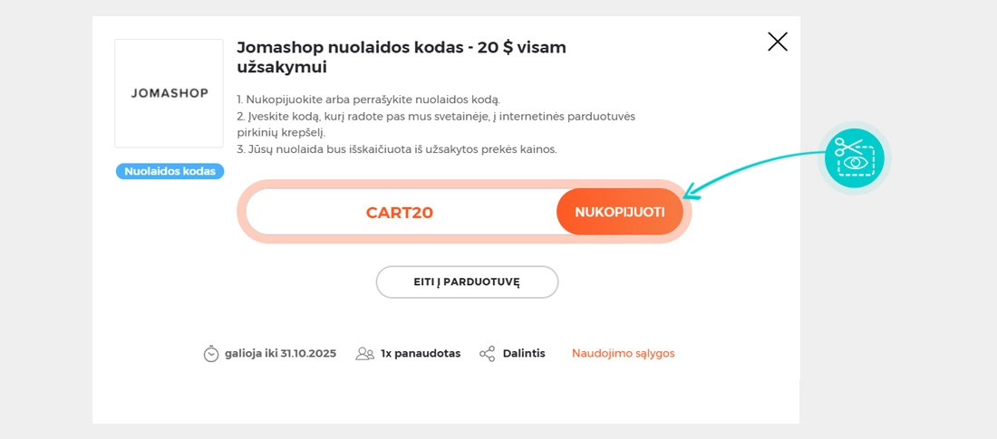 Nukopijuokite arba užsirašykite nuolaidos kodą ir paspauskite mygtuką „Eiti į parduotuvę“. Tada būsite nukreipti tiesiai į elektroninę parduotuvę Jomashop.com.
