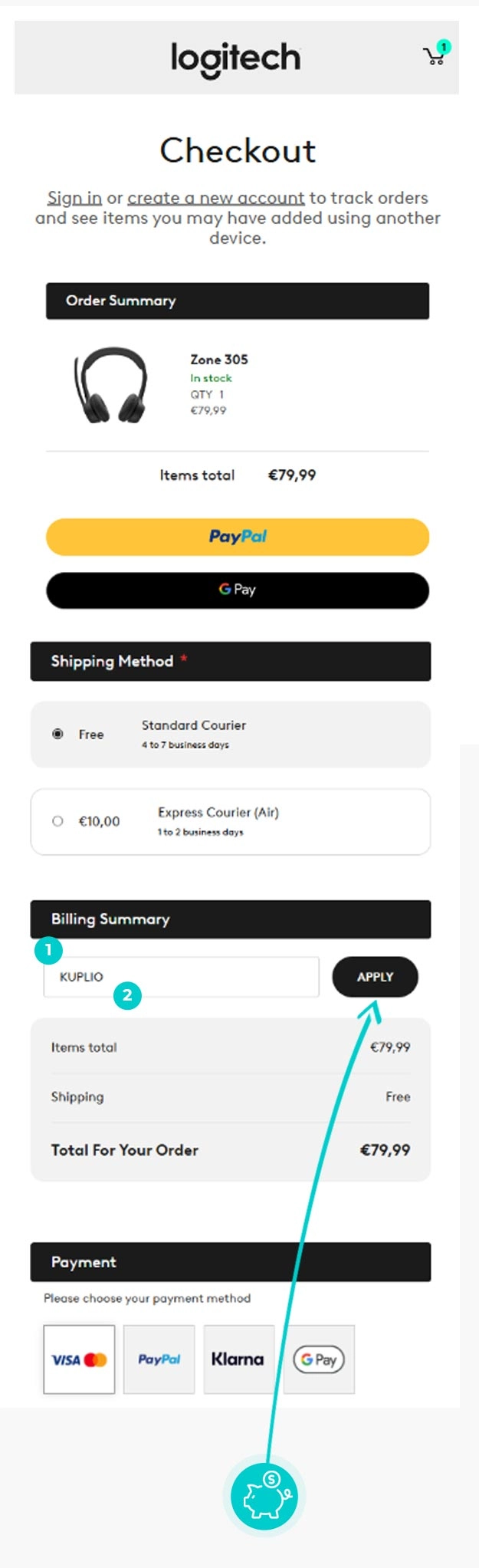 Išsirinkite Jus dominančią prekę elektroninėje parduotuvėje Logitech.com, paspauskite mygtuką "Į krepšelį" ir prekė bus automatiškai įtraukta į pirkinių krepšelį. Tiesiogiai pirkinių krepšelyje dešinėje skiltyje „Suvestinė“ rasite langelį „Įveskite nuolaidos kodą“. Nukopijuotą nuolaidos kodą įklijuokite čia arba įveskite rankiniu būdu ir patvirtinkite mygtuku „Taikyti“.