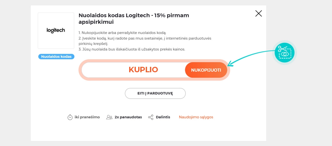 Mūsų svetainėje pasirinkite konkrečią Logitech nuolaidą ir spustelėkite mygtuką "Žiūrėti nuolaidą". Būsite automatiškai nukreipti tiesiai į internetinės parduotuvės Logitech.com reklaminį pasiūlymą, kuriame prekę galėsite įsigyti su nuolaida.