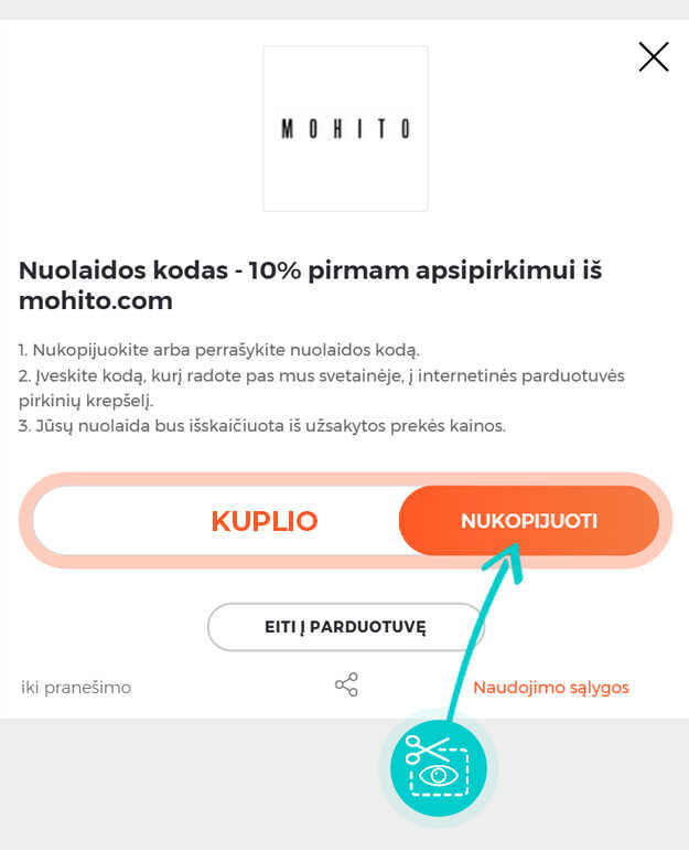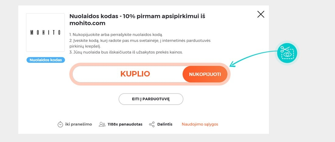 Nukopijuokite arba užsirašykite nuolaidos kodą ir paspauskite mygtuką „Eiti į parduotuvę“. Tada būsite nukreipti tiesiai į elektroninę parduotuvę Mohito.lt