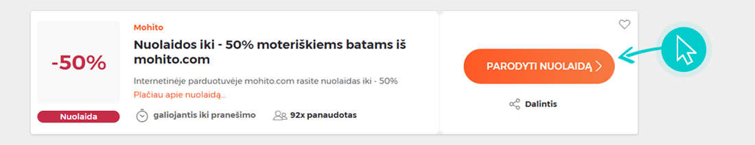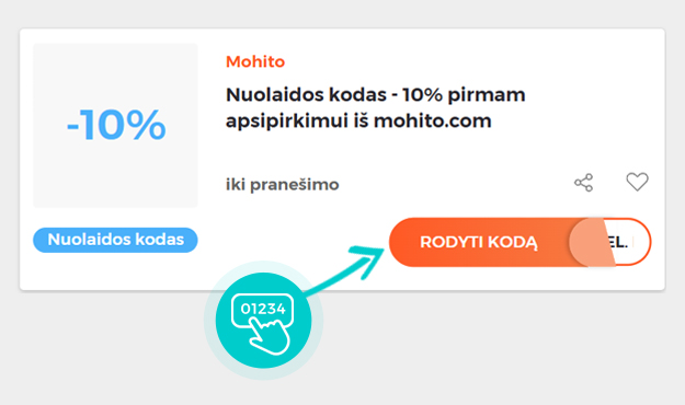 Mūsų svetainėje pasirinkite konkretų nuolaidos kodą, kurį norite panaudoti elektroninėje parduotuvėje Mohito.lt. Spustelėkite oranžinį mygtuką „Rodyti kodą“.