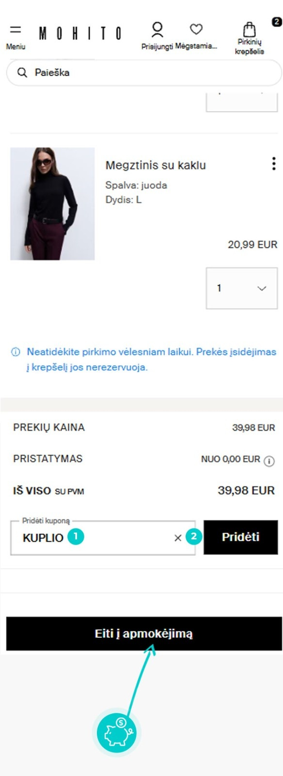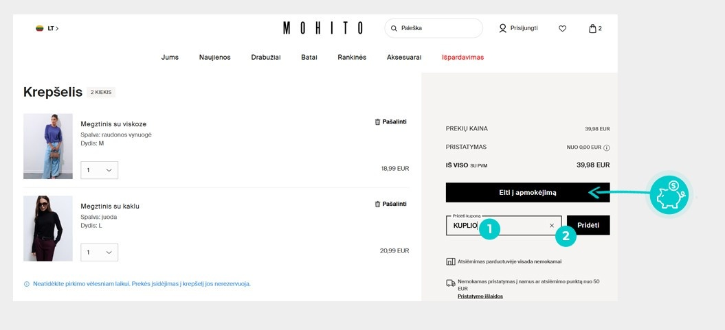 Nežinote kaip tiksliai veikia nuolaidų kodai Mohito.lt? Siūlome metodą, kaip greitai ir paprastai pritaikyti nuolaidų kodus perkant: