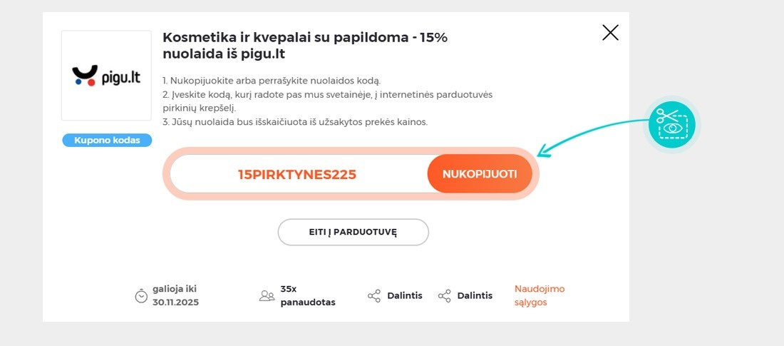 Nukopijuokite arba užsirašykite nuolaidos kodą ir paspauskite mygtuką „Eiti į parduotuvę“. Tada būsite nukreipti tiesiai į elektroninę parduotuvę Pigu.lt