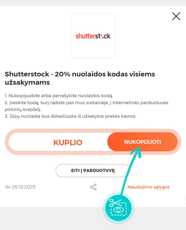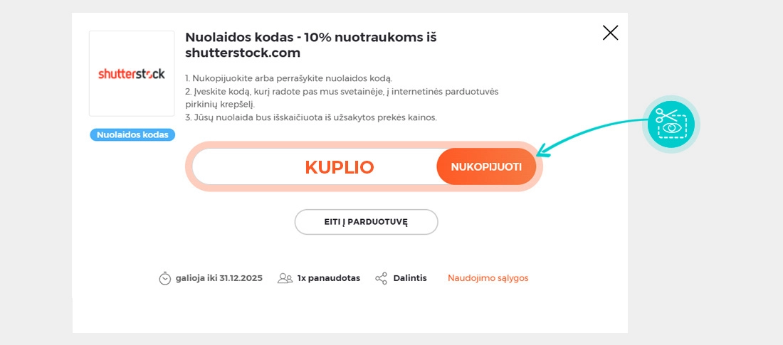 Nukopijuokite arba užsirašykite nuolaidos kodą ir paspauskite mygtuką „Eiti į parduotuvę“. Tada būsite nukreipti tiesiai į elektroninę parduotuvę Shutterstock.com
