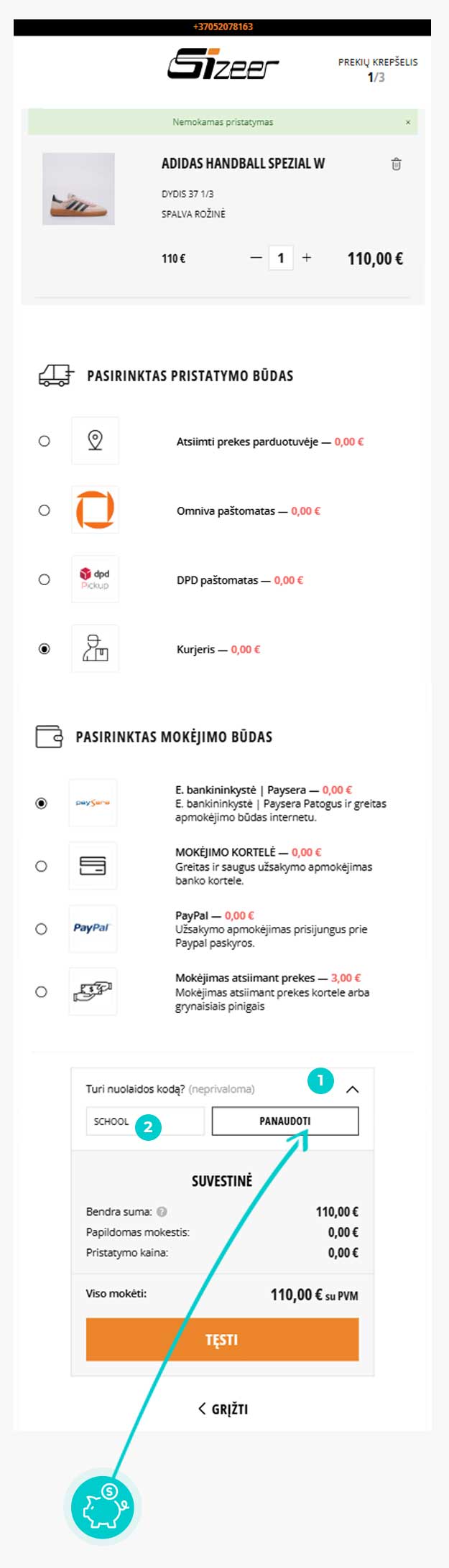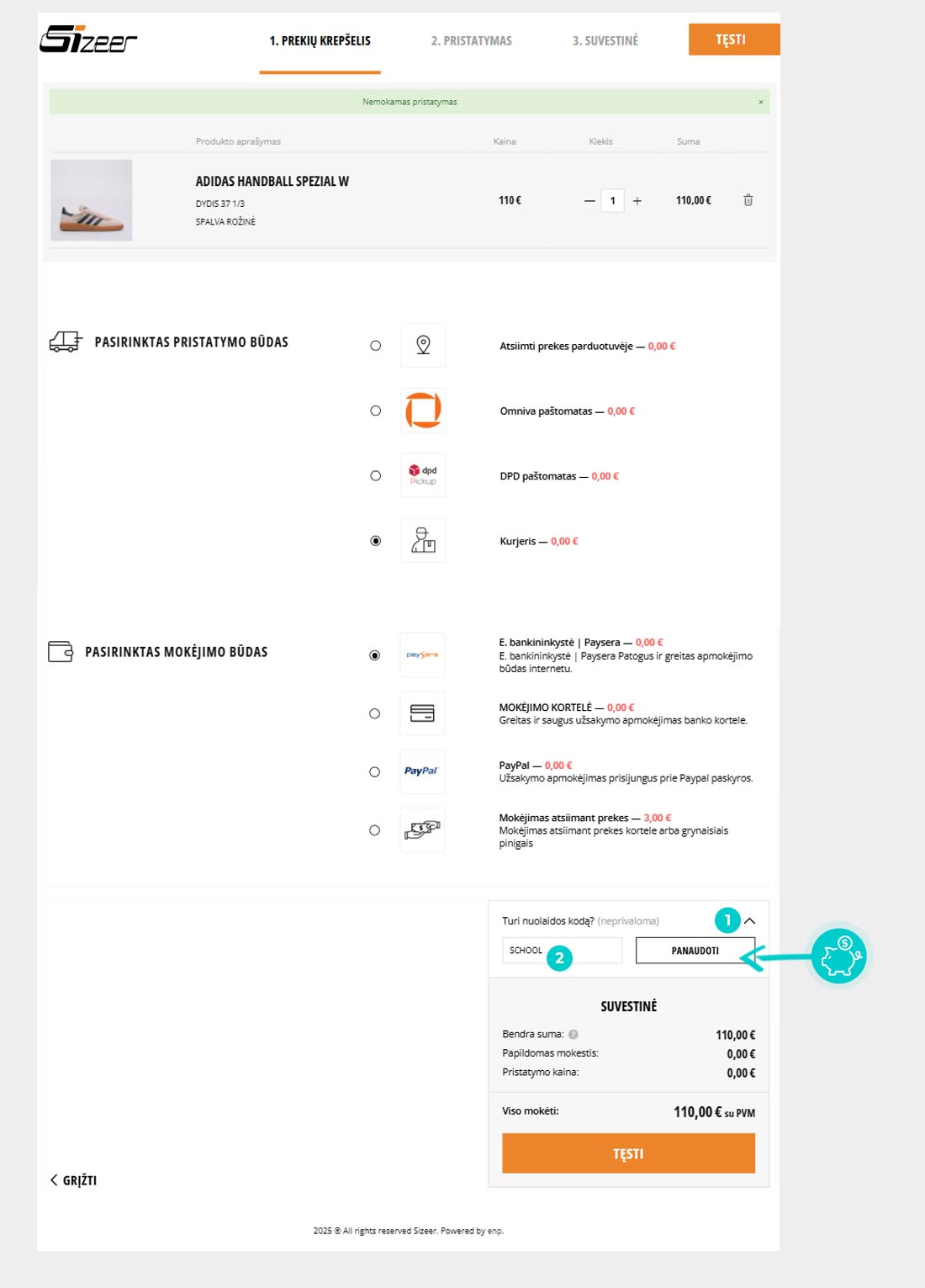 Išsirinkite Jus dominančią prekę elektroninėje parduotuvėje Sizeer.lt, paspauskite mygtuką "Į krepšelį" ir prekė bus automatiškai įtraukta į pirkinių krepšelį. Tiesiogiai pirkinių krepšelyje dešinėje skiltyje „Suvestinė“ rasite langelį „Įveskite nuolaidos kodą“. Nukopijuotą nuolaidos kodą įklijuokite čia arba įveskite rankiniu būdu ir patvirtinkite mygtuku „Taikyti“.