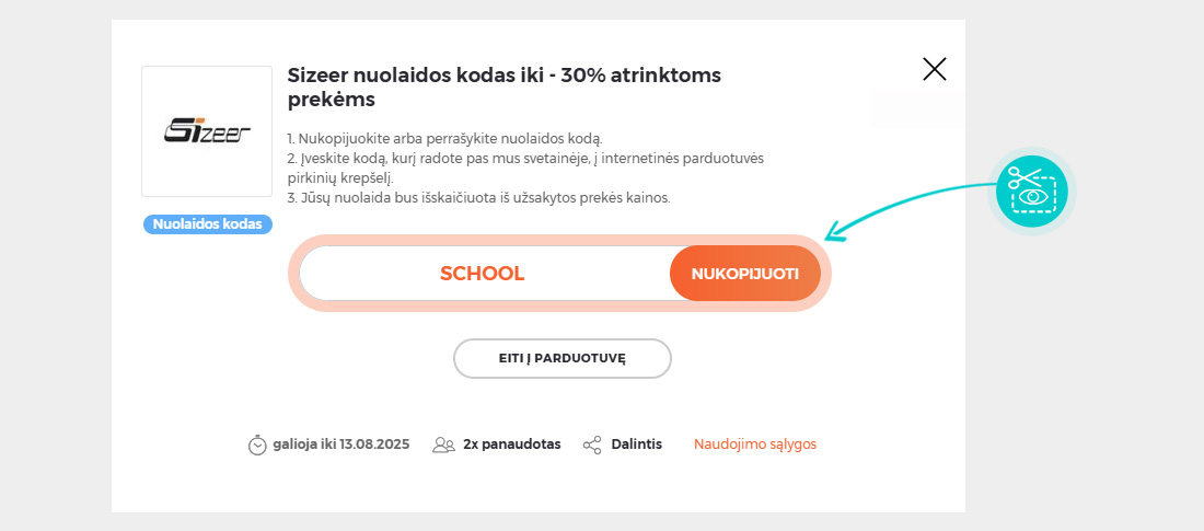 Nukopijuokite arba užsirašykite nuolaidos kodą ir paspauskite mygtuką „Eiti į parduotuvę“. Tada būsite nukreipti tiesiai į elektroninę parduotuvę Sizeer.lt