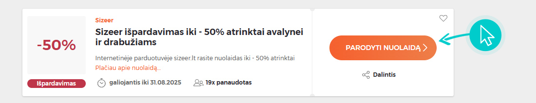 Mūsų svetainėje pasirinkite konkrečią Sizeer nuolaidą ir spustelėkite mygtuką "Žiūrėti nuolaidą". Būsite automatiškai nukreipti tiesiai į internetinės parduotuvės Sizeer.lt reklaminį pasiūlymą, kuriame prekę galėsite įsigyti su nuolaida.