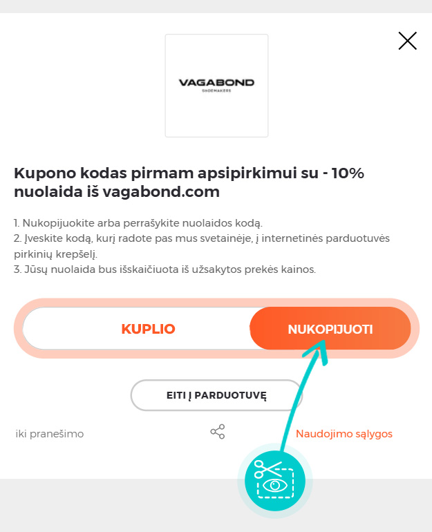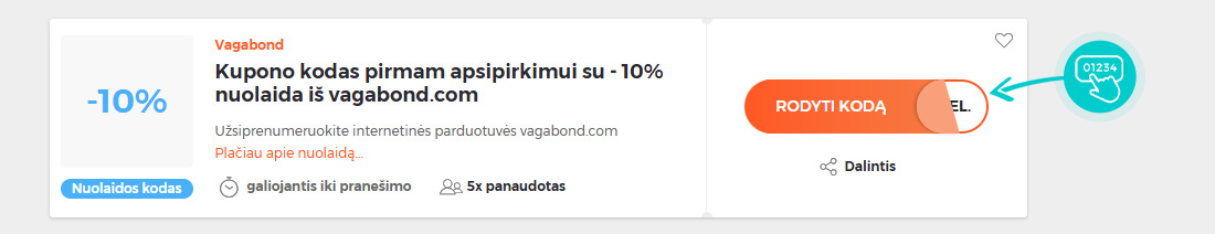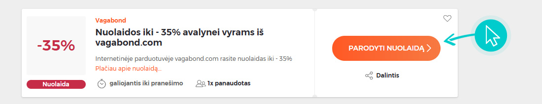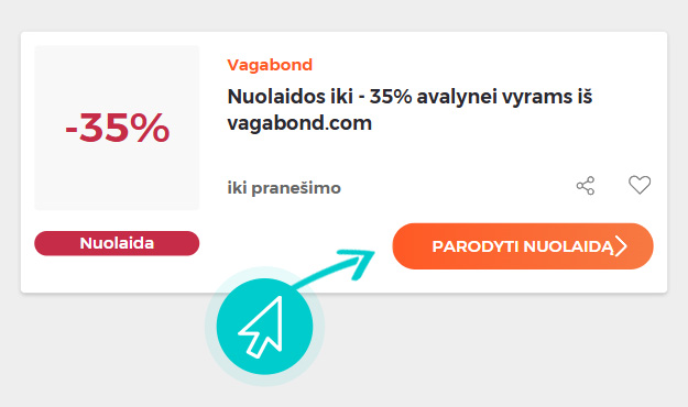 Mūsų svetainėje pasirinkite konkrečią Vagabond nuolaidą ir spustelėkite mygtuką "Žiūrėti nuolaidą". Būsite automatiškai nukreipti tiesiai į internetinės parduotuvės Vagabond.com reklaminį pasiūlymą, kuriame prekę galėsite įsigyti su nuolaida.