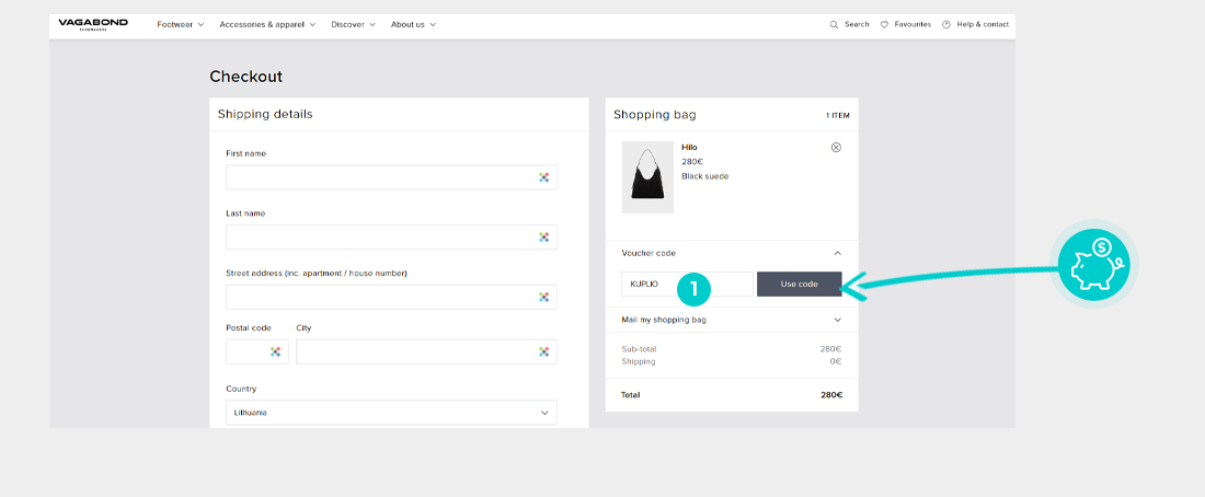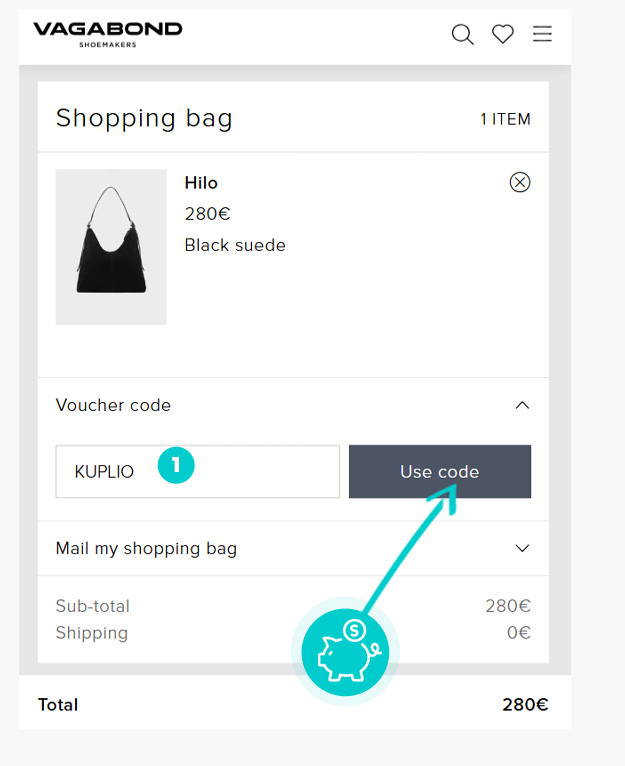 Išsirinkite Jus dominančią prekę elektroninėje parduotuvėje Vagabond.com, paspauskite mygtuką "Į krepšelį" ir prekė bus automatiškai įtraukta į pirkinių krepšelį. Tiesiogiai pirkinių krepšelyje dešinėje skiltyje „Suvestinė“ rasite langelį „Įveskite nuolaidos kodą“. Nukopijuotą nuolaidos kodą įklijuokite čia arba įveskite rankiniu būdu ir patvirtinkite mygtuku „Taikyti“.